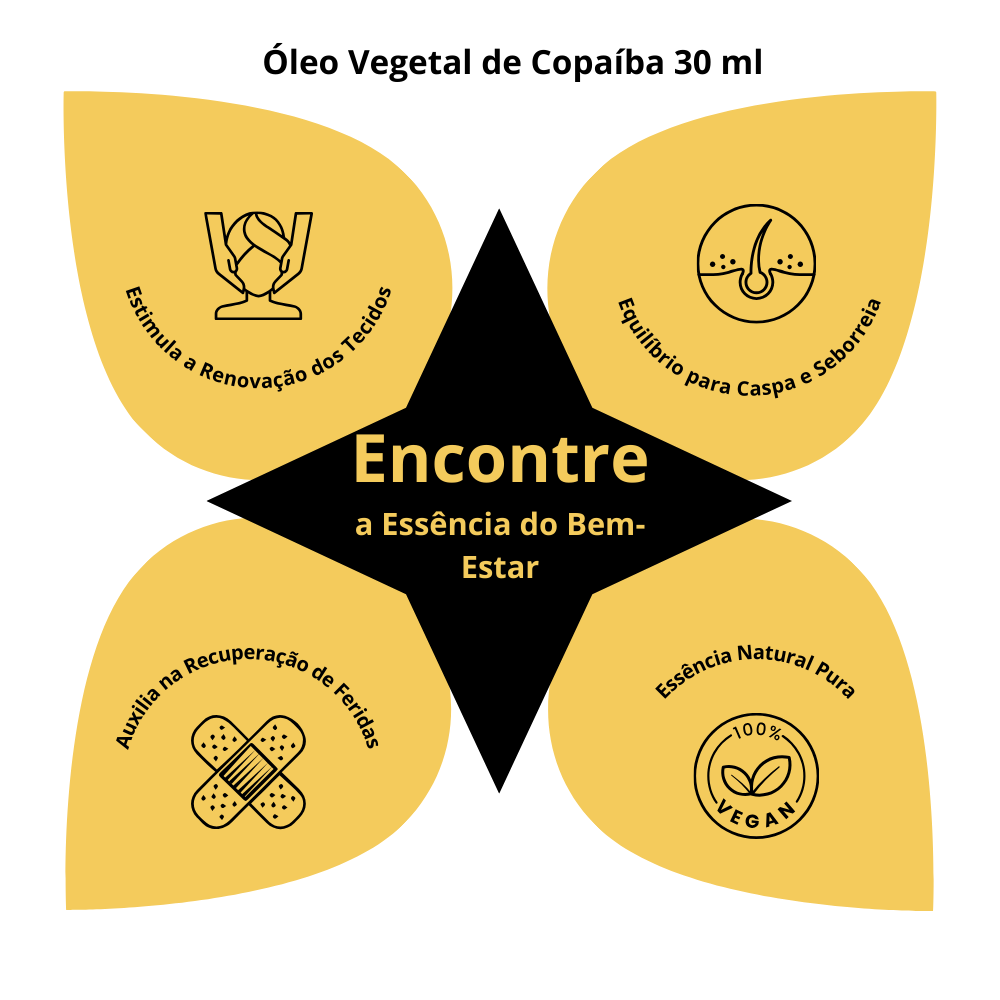 Composição: Óleo vegetal 100% puro da planta Copaifera officinalis. Livre de conservantes e produtos químicos.